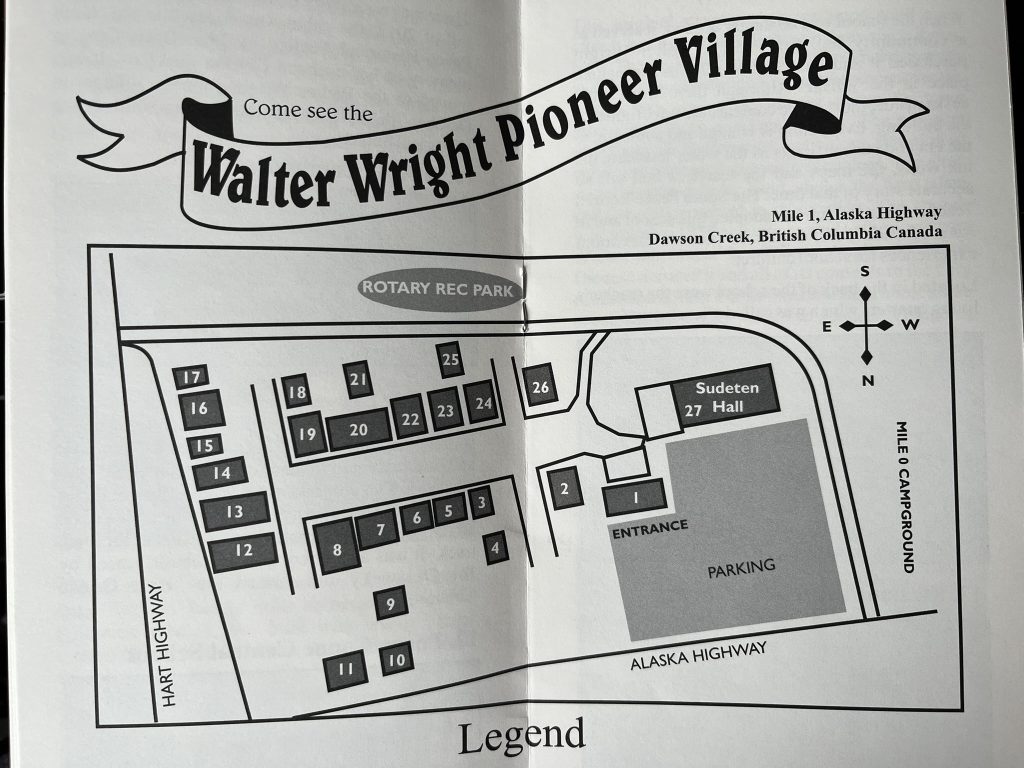 The Walter Wright Pioneer Village is by donation as it is run by the Mile Zero Park Society. There is a collection area when you walk through the entrance to the grounds. When you pass through the entrance there are also pamphlets to do a self-guided tour of the village and other information about things to do and see along the Alaska Highway. We picked up these pamphlets to learn more and to see where we should visit next!
